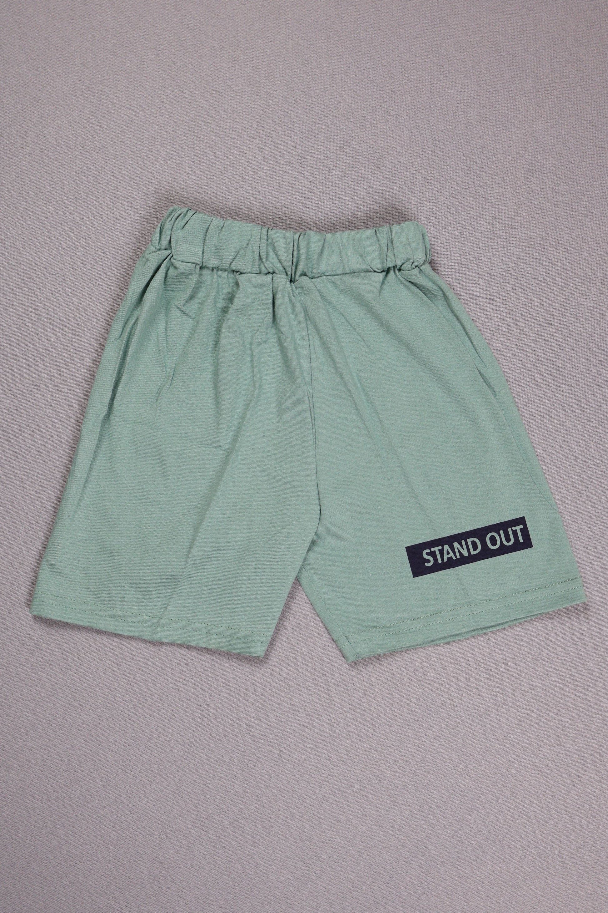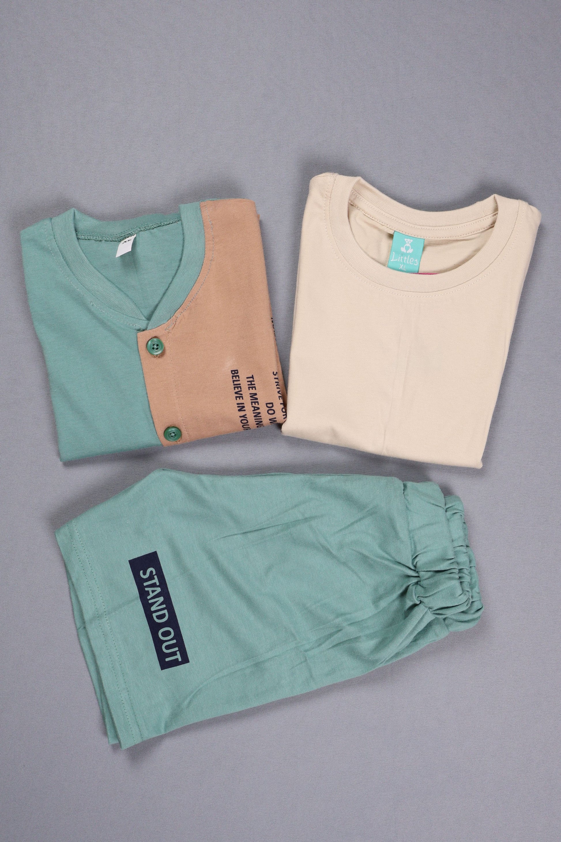Including a unique green and beige buttoned top with black printed motivational text and comfortable printed shorts, this set combines style with all-night comfort. Made of soft and breathable cotton fabric, it supports restful sleep and relaxed lounging for kids. Its functional and attractive design makes it a practical favorite for everyday bedtime wear.H