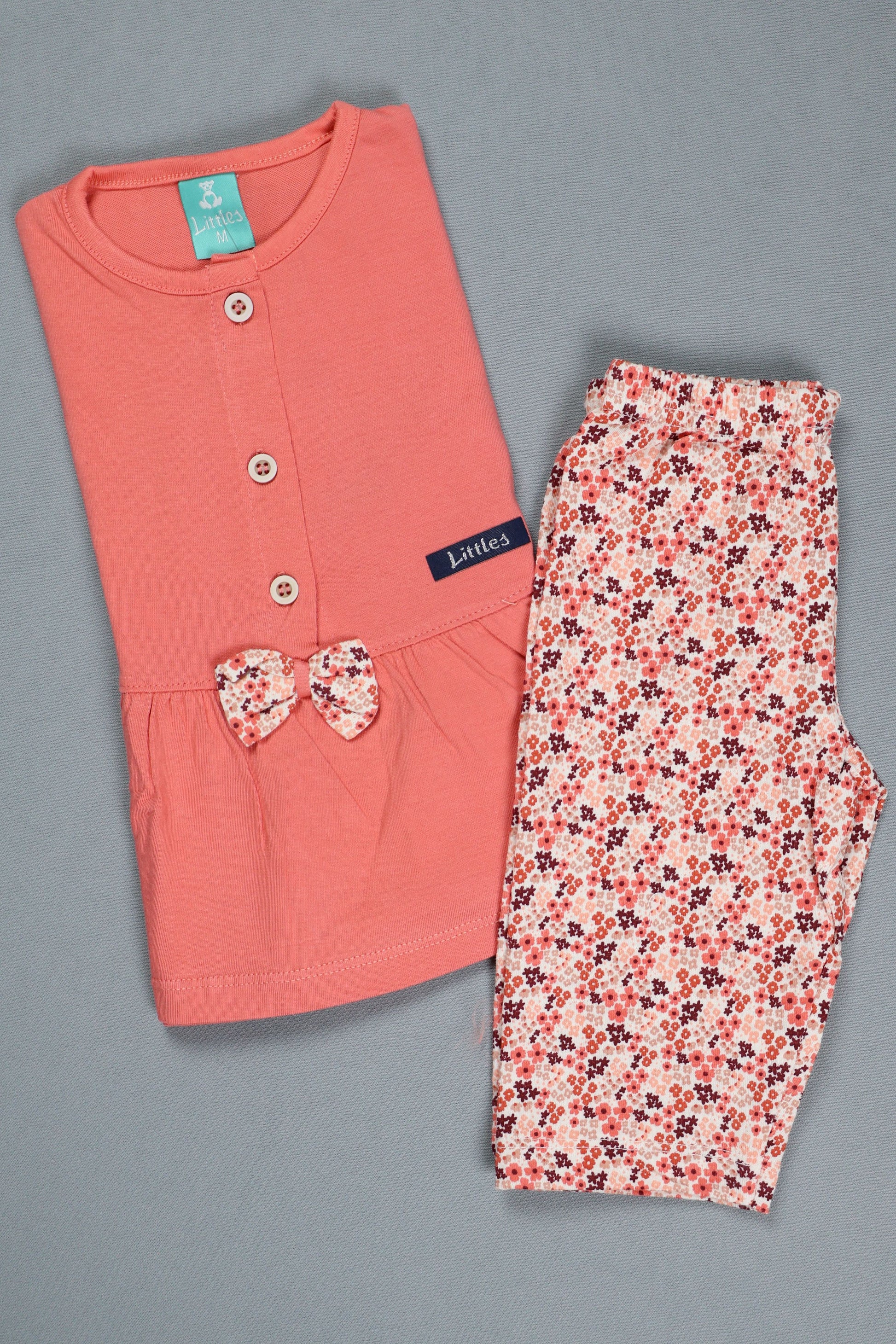 The set features a peachy-pink dress with button detail, fluttery sleeves lined with tiny daisy prints, and a matching floral bow at the waist, complemented by soft, stretch-fit leggings with an all-over miniature flower pattern. Made of breathable, cotton-rich fabric for sensitive skin, this set is ideal for everyday adventures and comfortable wear. Cute, functional, and easy to maintain, this coordinated outfit ensures your baby enjoys both style and playtime comfort.