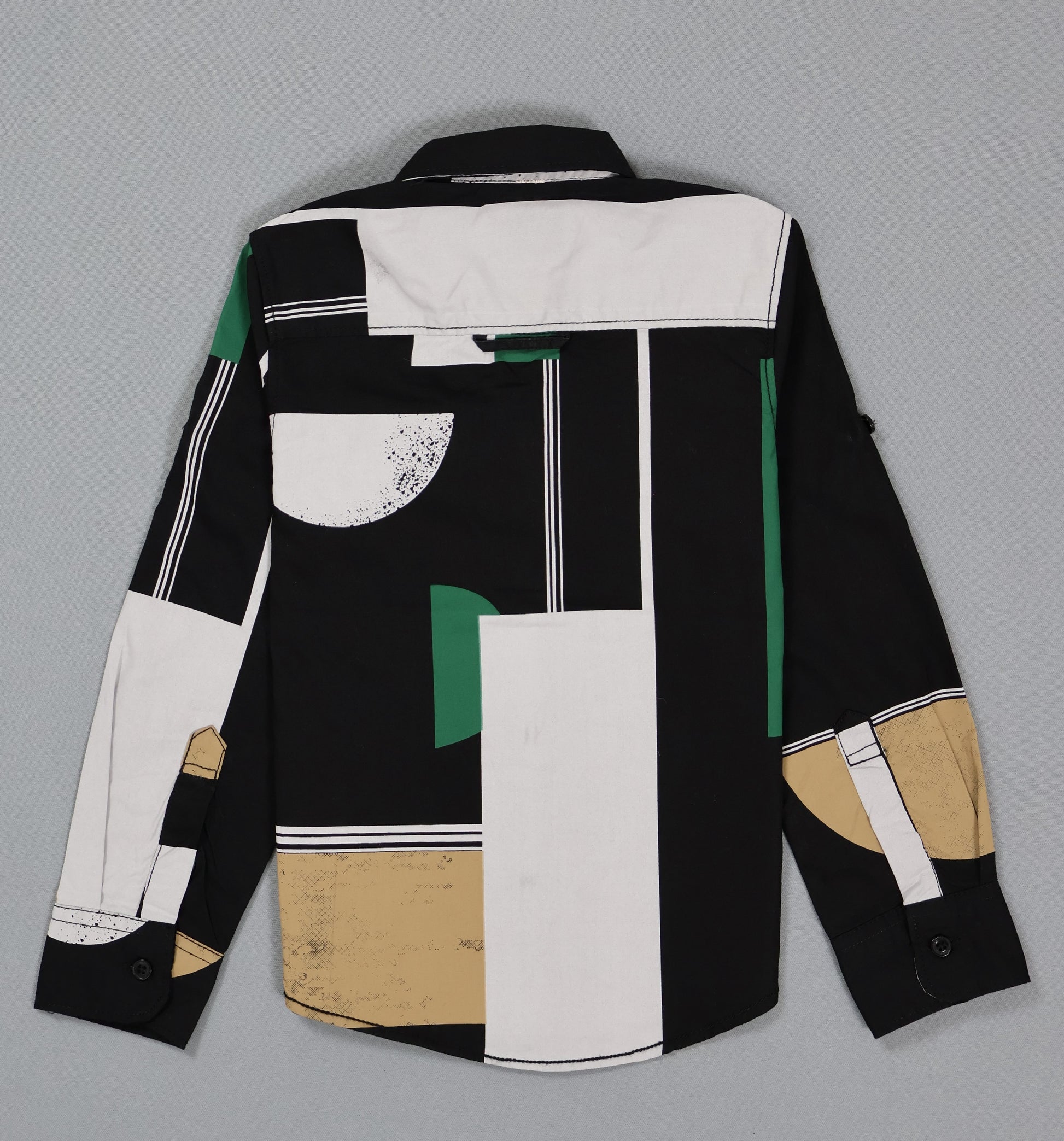 Made of smooth, durable cotton blend, this shirt features striking green, beige, and white abstract geometric designs with a chest pocket and button-up front. The roll-up sleeves and crisp collar provide versatile styling for comfort and fashion. It's easy to care for and eye-catching, ensuring both standout looks and lasting wearability.Here are three-sentence writeups for the shipping details and additional information fields for the black geometric print button-up shirt: