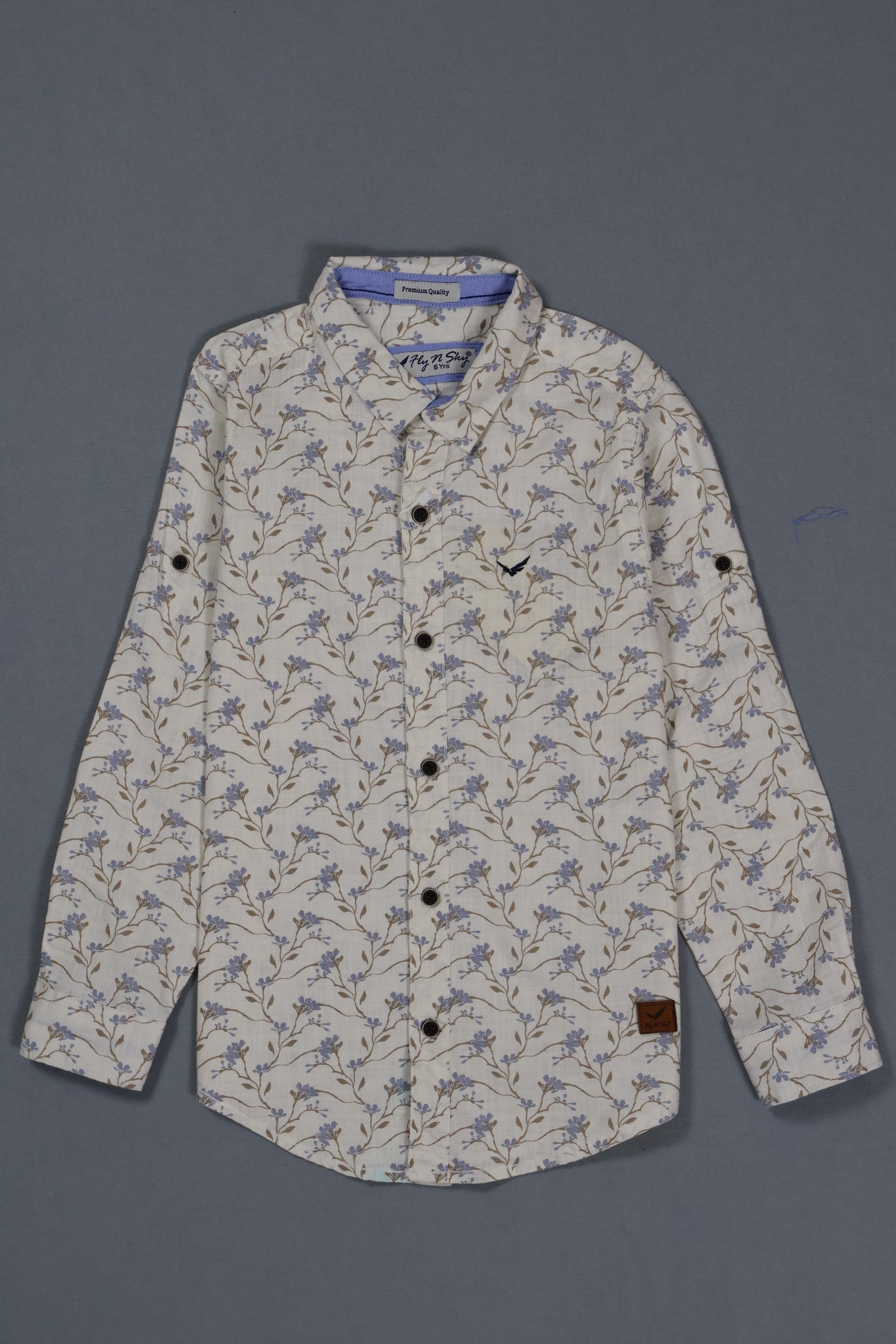 This shirt showcases a soft off-white color adorned with an all-over botanical print in lavender and tan, completed by brown buttons, a chest embroidery, and a modern tapered fit. Crafted from a lightweight, breathable fabric, this piece is ideal for special occasions, festive outings, or polished everyday wear, easily paired with trousers or jeans. Perfect for boys who enjoy subtle patterns and gentle aesthetics, this shirt brings a touch of elegance and charm to any young wardrobe.