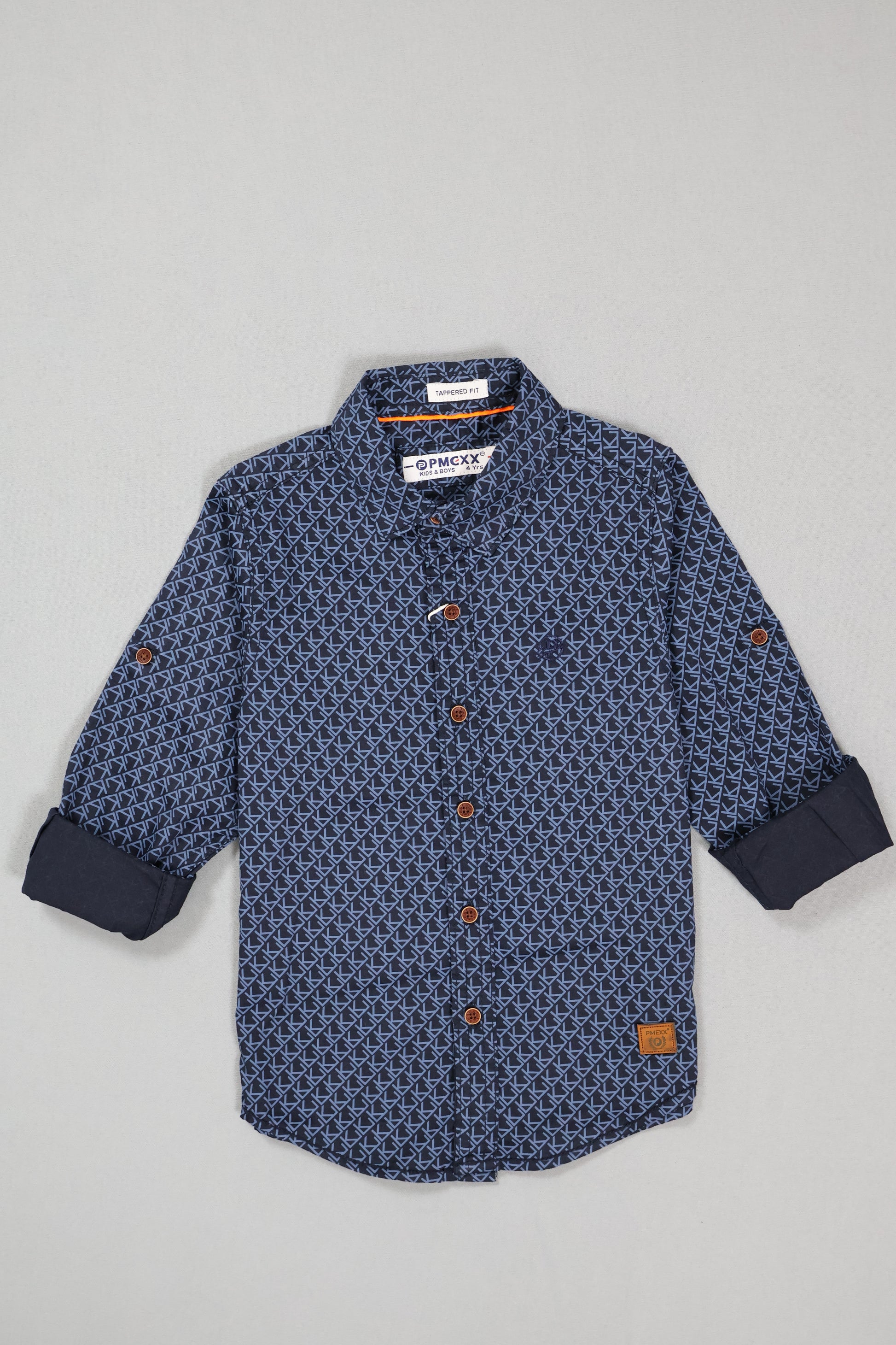 This modern shirt boasts a sharp navy base adorned with repeating light blue geometric designs, accented by brown buttons and a crisp collar for a smart casual or semi-formal look. The lightweight, breathable fabric and roll-tab sleeves make it comfortable and versatile for daily wear, events, or festive occasions. Suited for boys who appreciate standout patterns and contemporary style, this piece easily pairs with pants or jeans for an elevated wardrobe choice.