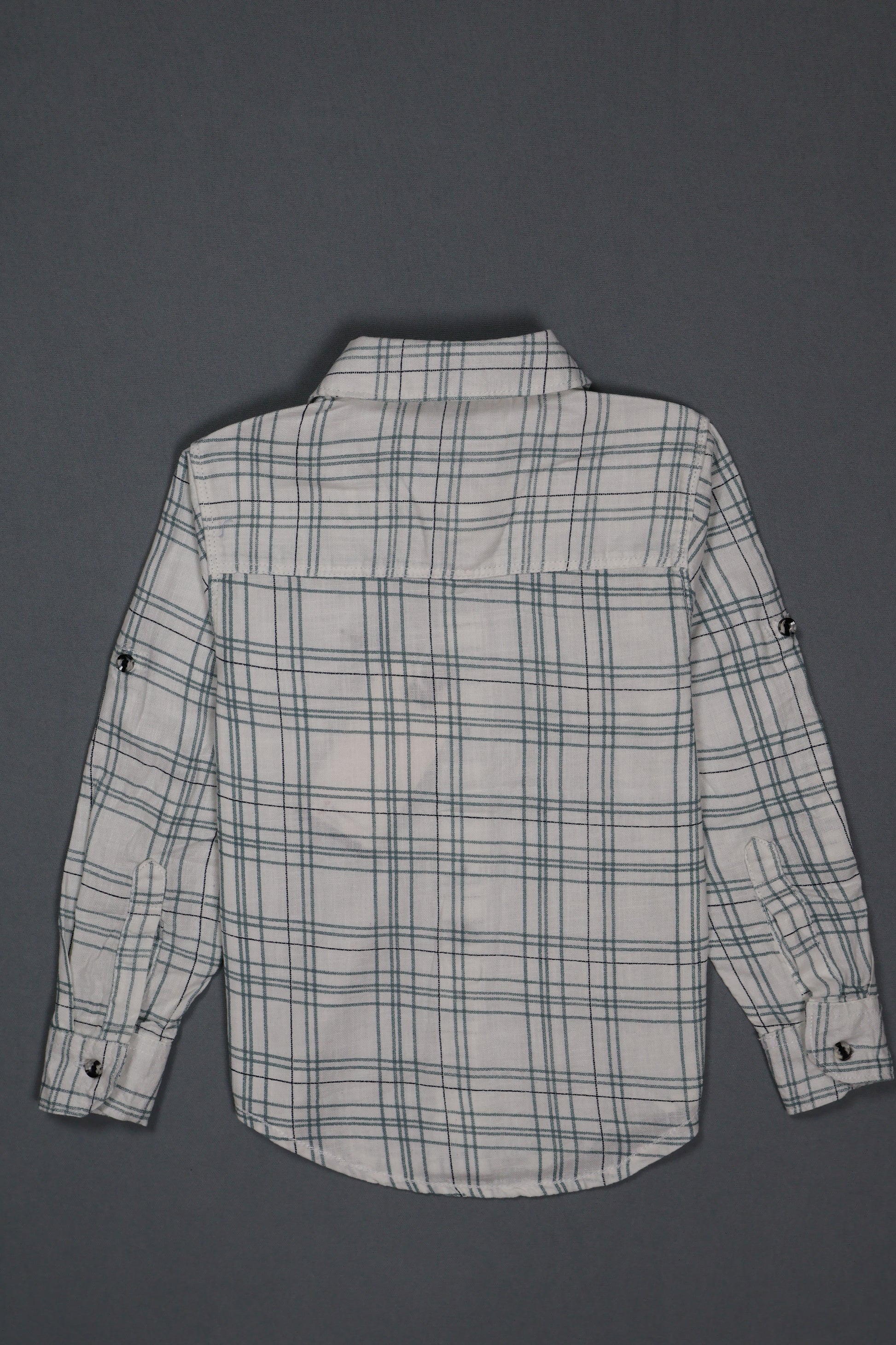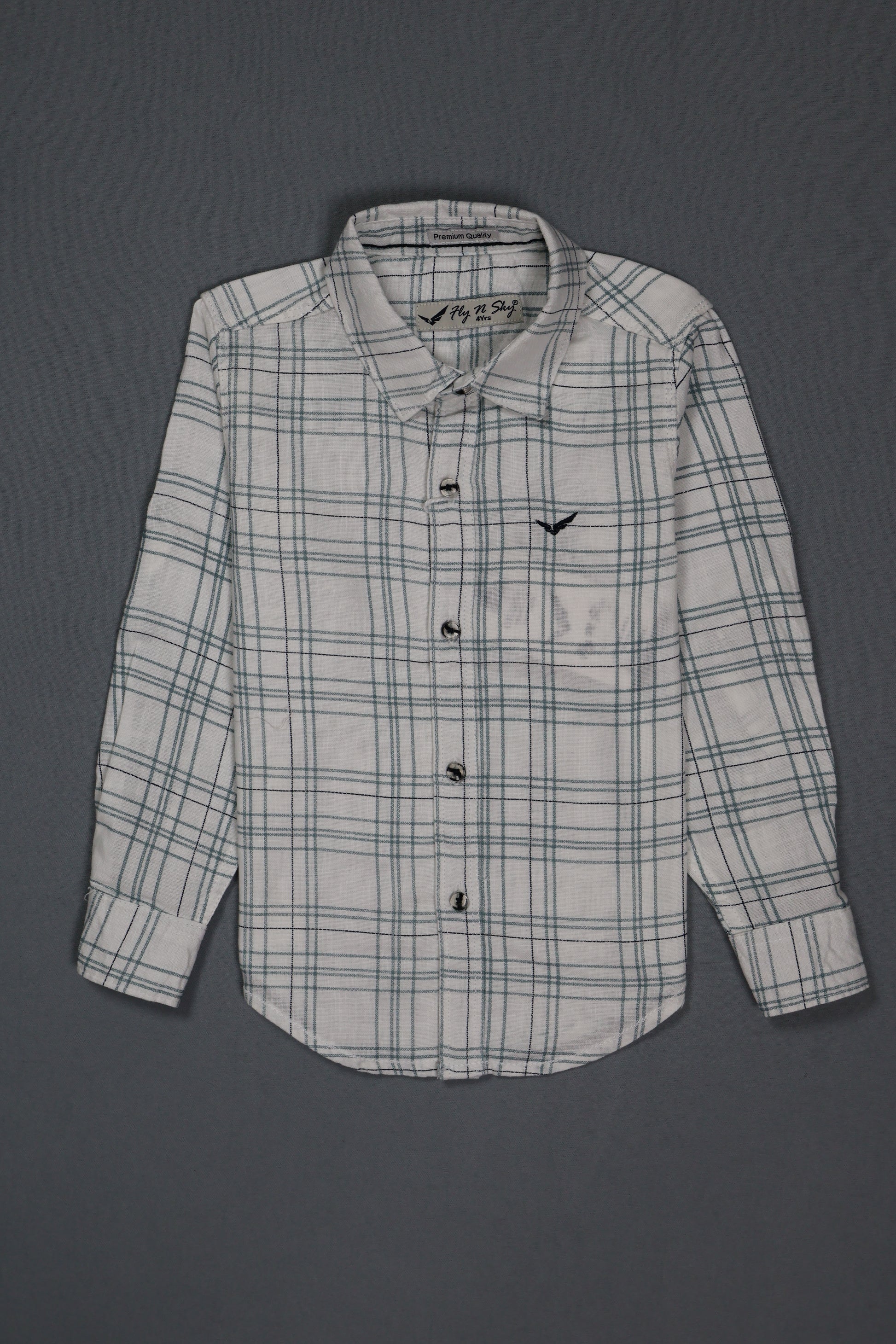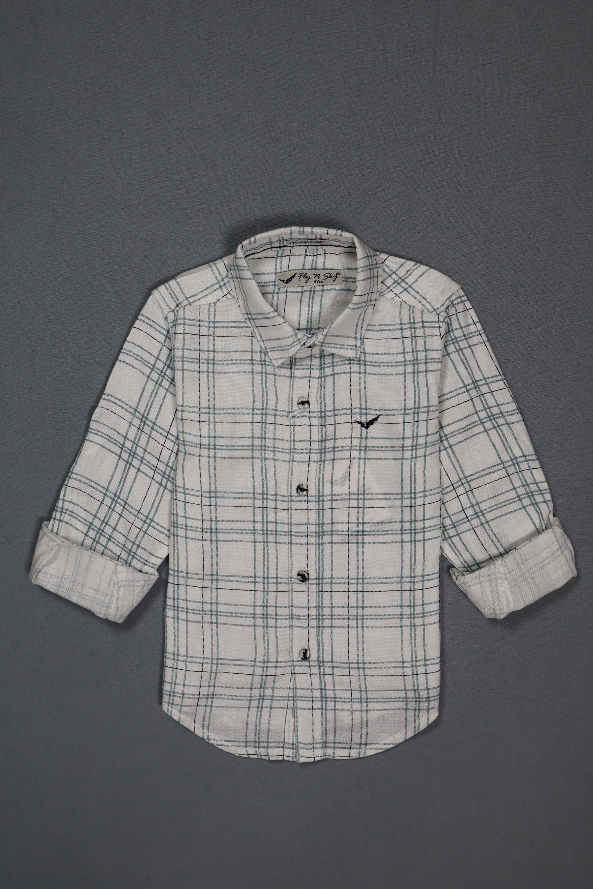 Featuring a classic windowpane check in a gentle green hue against a bright off-white background, this shirt is accented by matching green stitching, subtle embroidered logo, and sturdy brown buttons. Crafted from lightweight, breathable cotton in a tapered fit, it’s ideal for everyday wear, family gatherings, or semi-formal events, easily paired with chinos or denim. Designed for boys who appreciate timeless patterns with modern comfort, this shirt adds polished style to any wardrobe.