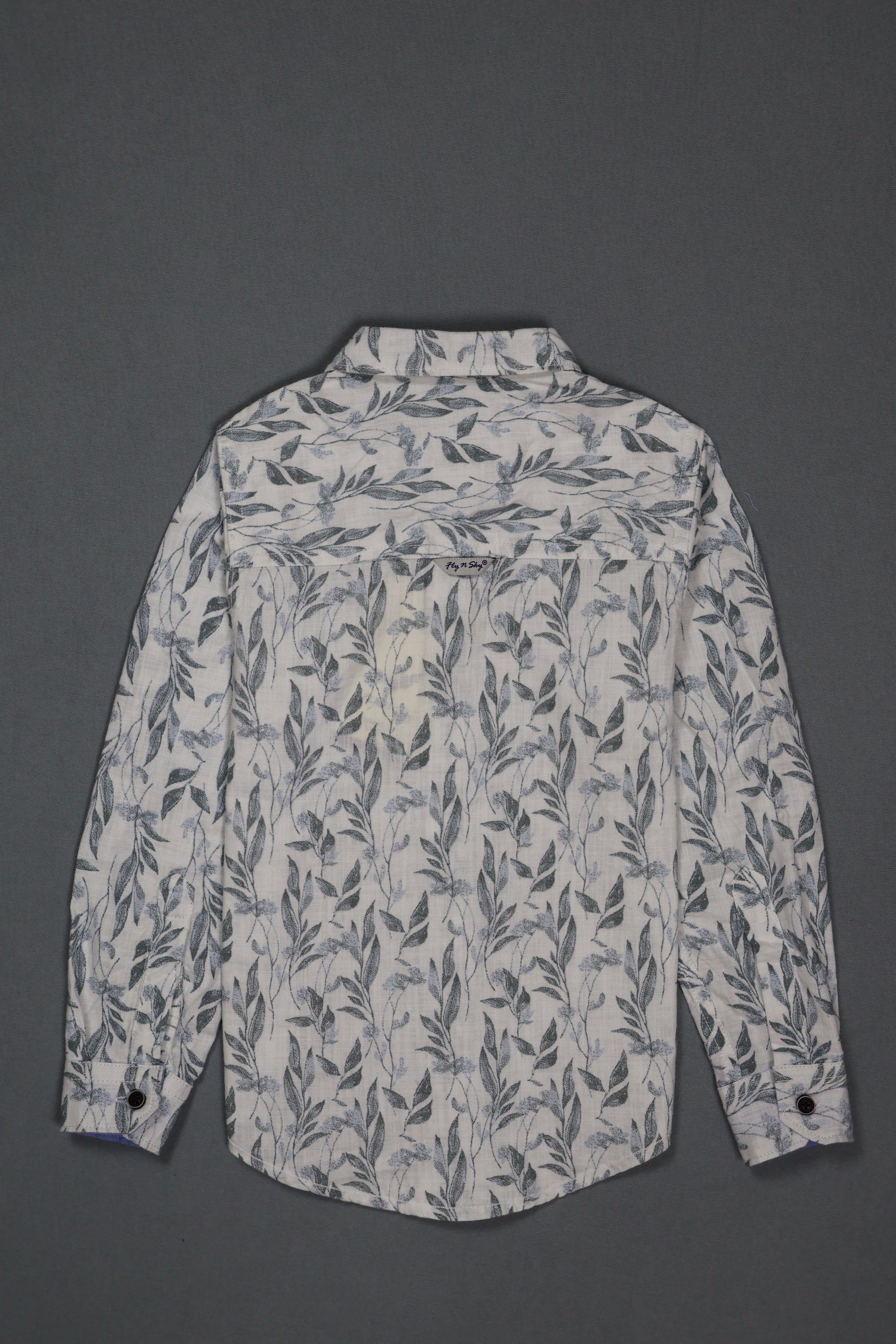 Featuring an elegant all-over gray leaf pattern, this shirt includes a classic collar, button-front design with dark wood–tone buttons, and a roll-tab sleeve option for versatile styling. Crafted from lightweight, breathable cotton with a modern tapered fit, it’s perfect for family gatherings, festive events, or polished everyday wear. Ideal for boys who appreciate refined patterns and comfortable tailoring, this shirt adds a tasteful, nature-inspired touch to any young wardrobe.