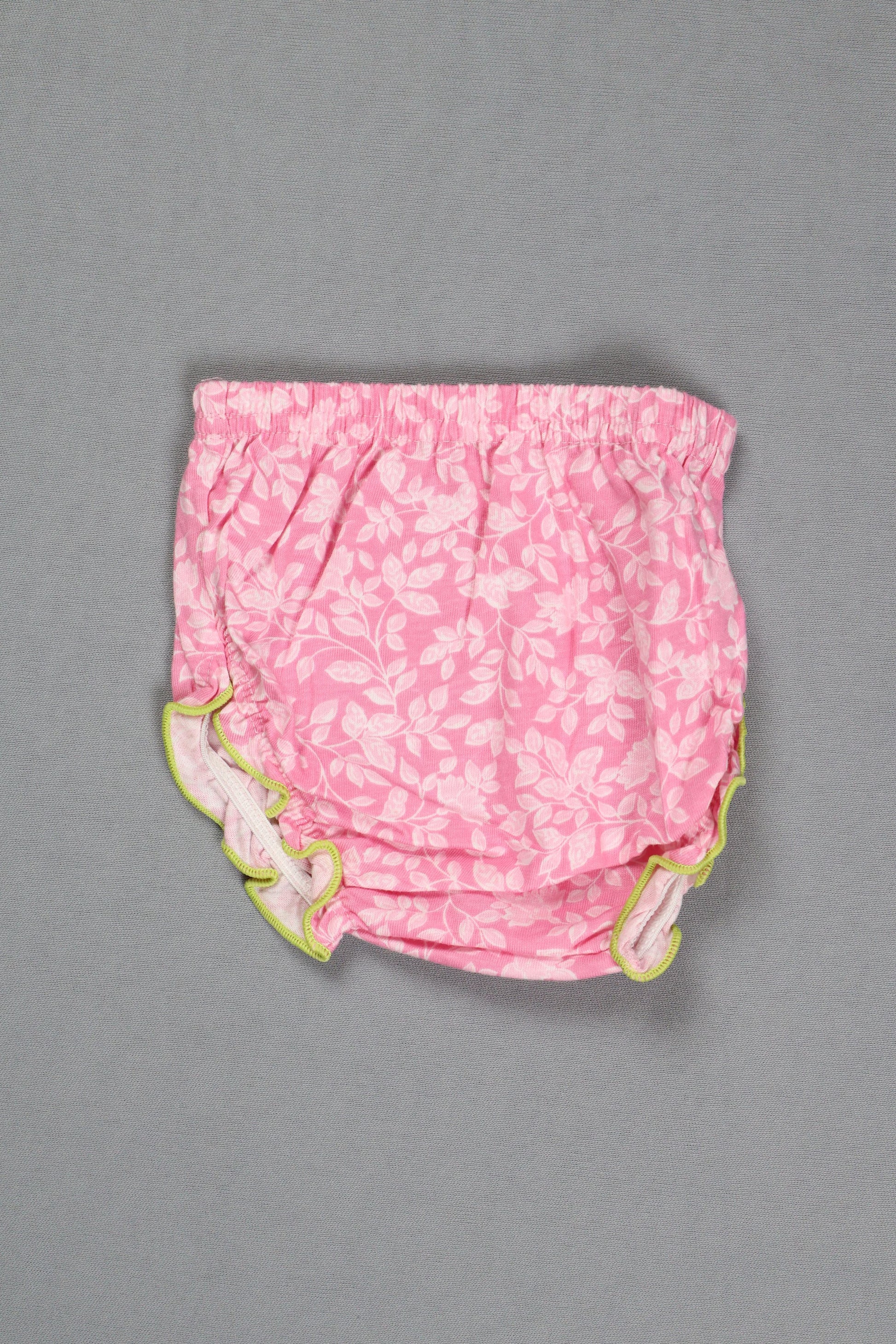 Designed with a cheerful lime green top and flutter sleeves, this frock features a pink skirt adorned with subtle white leaves and flowers for a sweet, classic look. Made of lightweight, breathable cotton, it’s ideal for summer days, family celebrations, or playtime, offering freedom of movement and comfort all day. The detailed lace, colorful buttons, and soft printed skirt make this dress perfect for girls who love lively colors and timeless floral patterns.