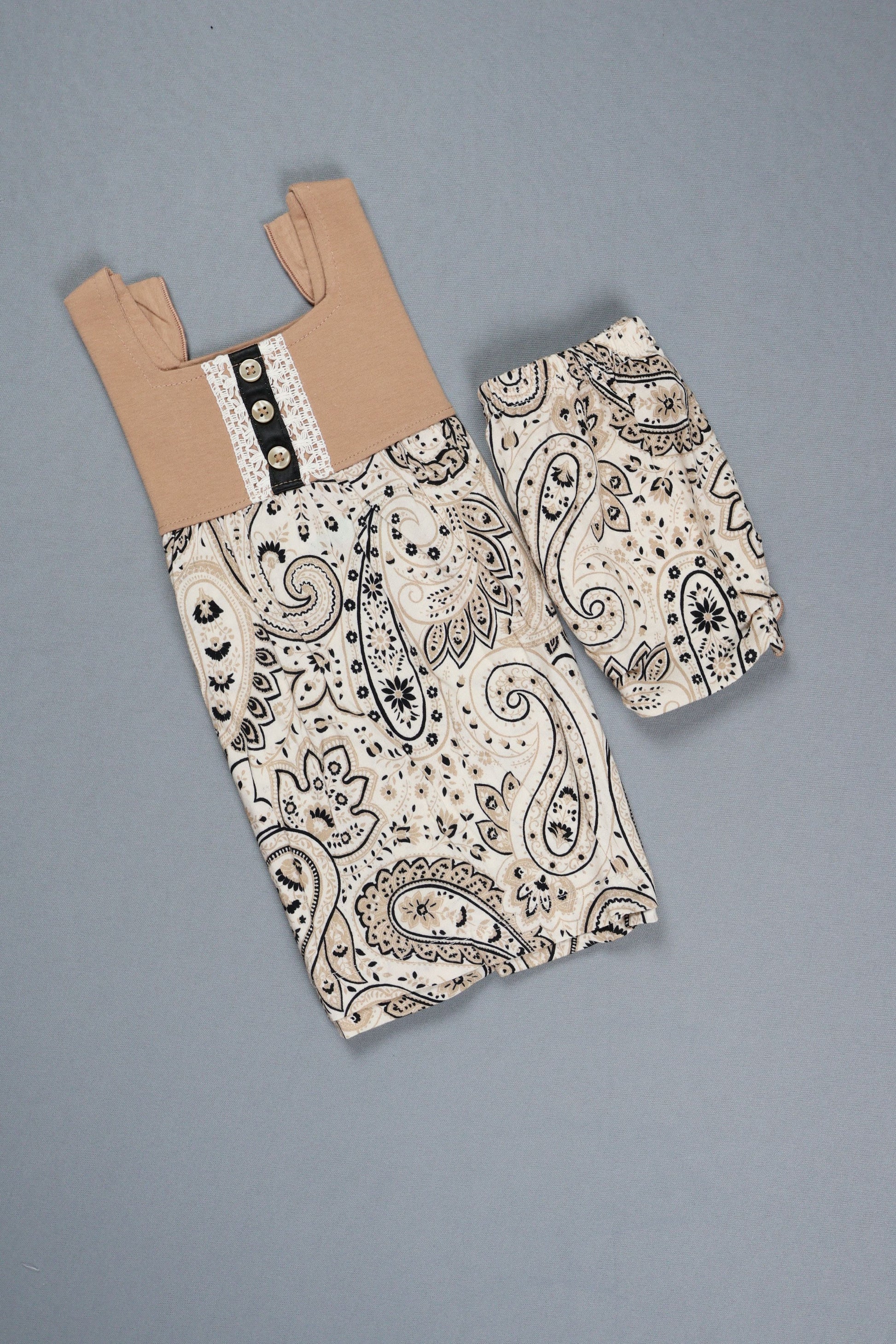 Blending classic charm and contemporary comfort, this frock showcases a beige top with lace and wooden-style buttons, complemented by a skirt adorned in a refined paisley motif. The breathable cotton fabric is gentle on skin, perfect for festive occasions, family gatherings, or day-to-day elegance. Ideal for girls who appreciate timeless patterns, this dress offers a stylish neutral palette that pairs well with simple accessories for a sophisticated look.