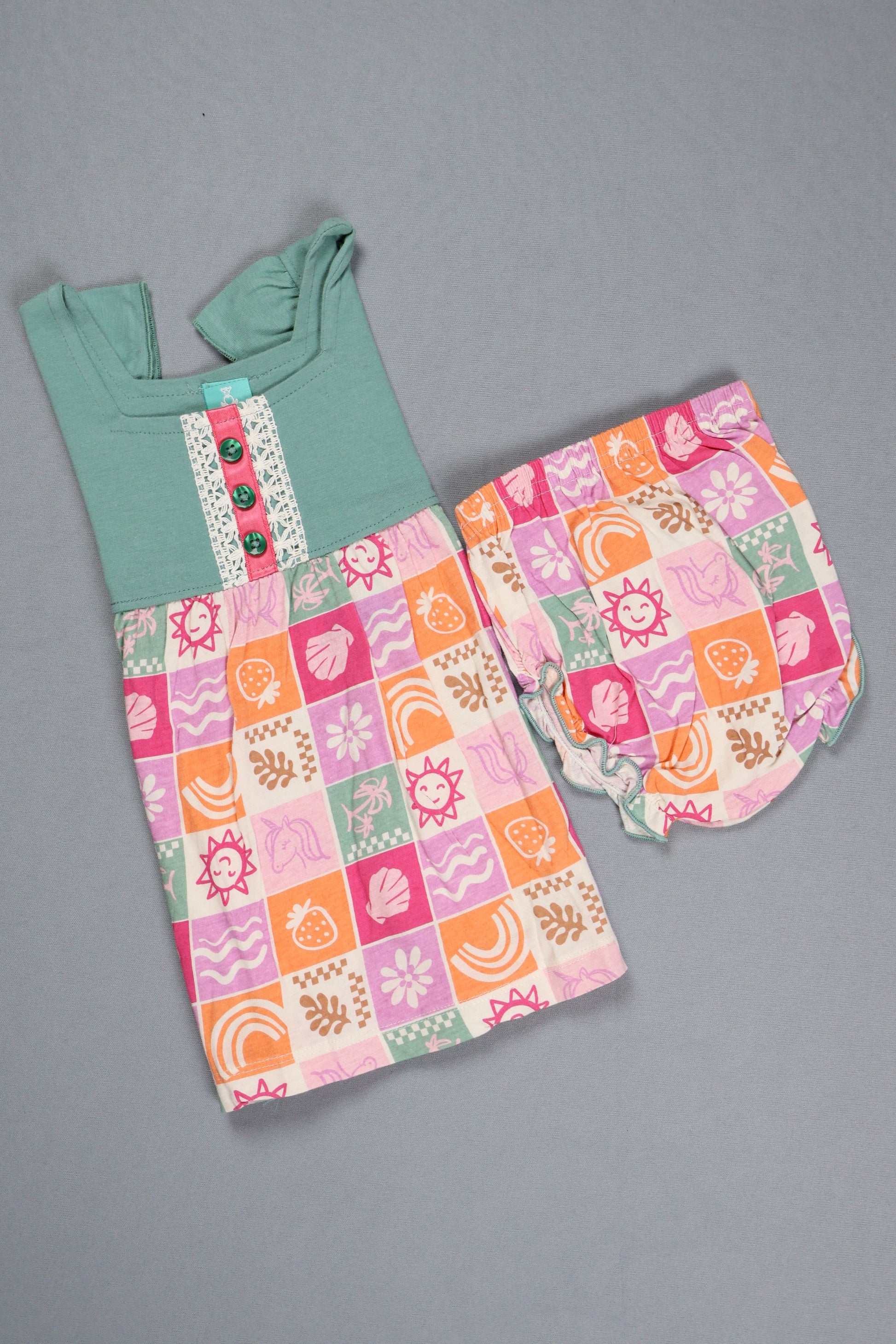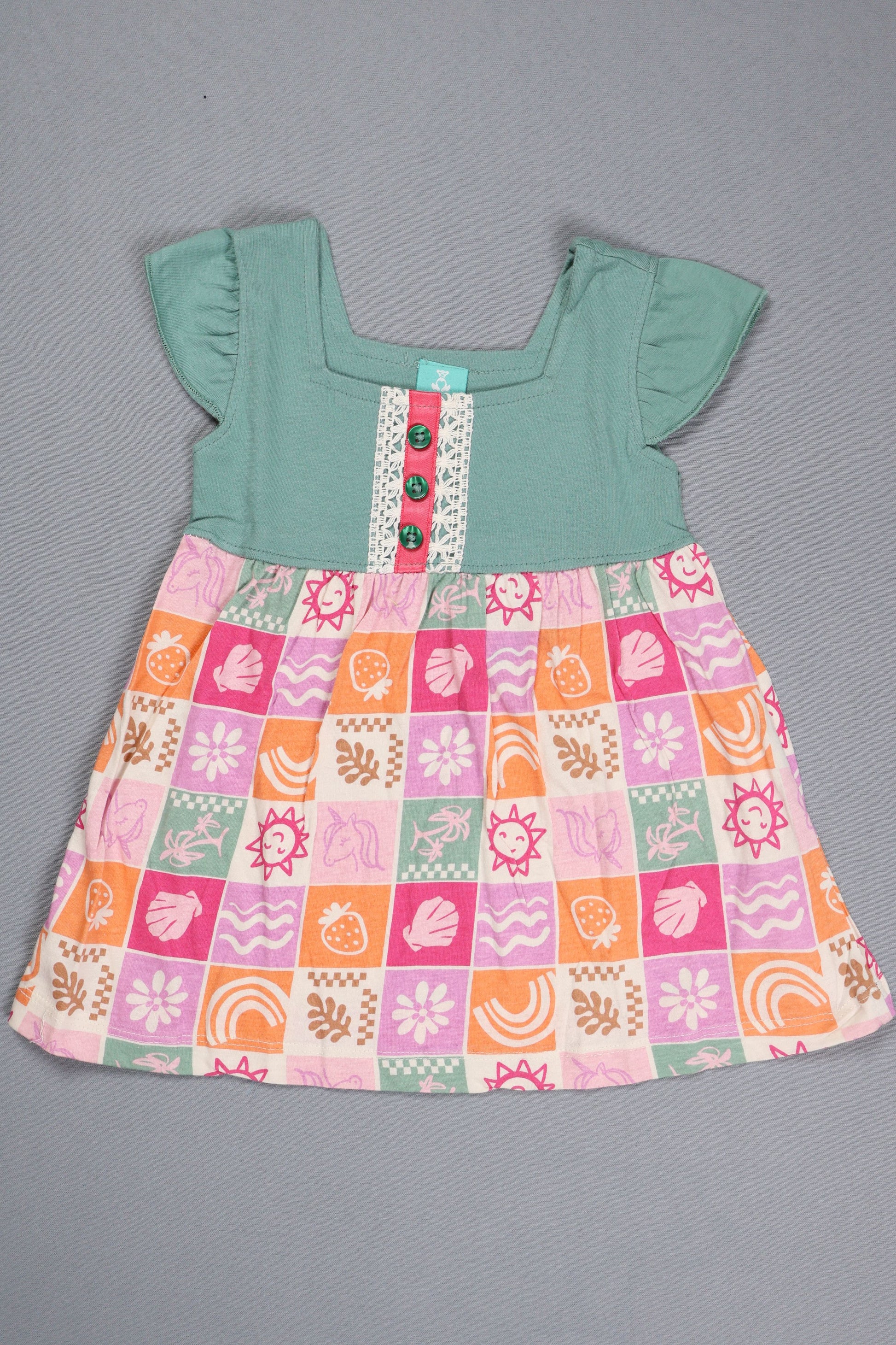 Showcasing a soft green top with lace and decorative buttons, this frock transitions into a multicolored skirt filled with whimsical suns, florals, strawberries, and nature icons in pastel tones. The lightweight cotton fabric is gentle for everyday play, yet festive enough for parties and special occasions, offering both comfort and freedom of movement. Its patchwork style and vibrant colors make this dress a favorite for girls seeking playful, standout designs with a fun touch.