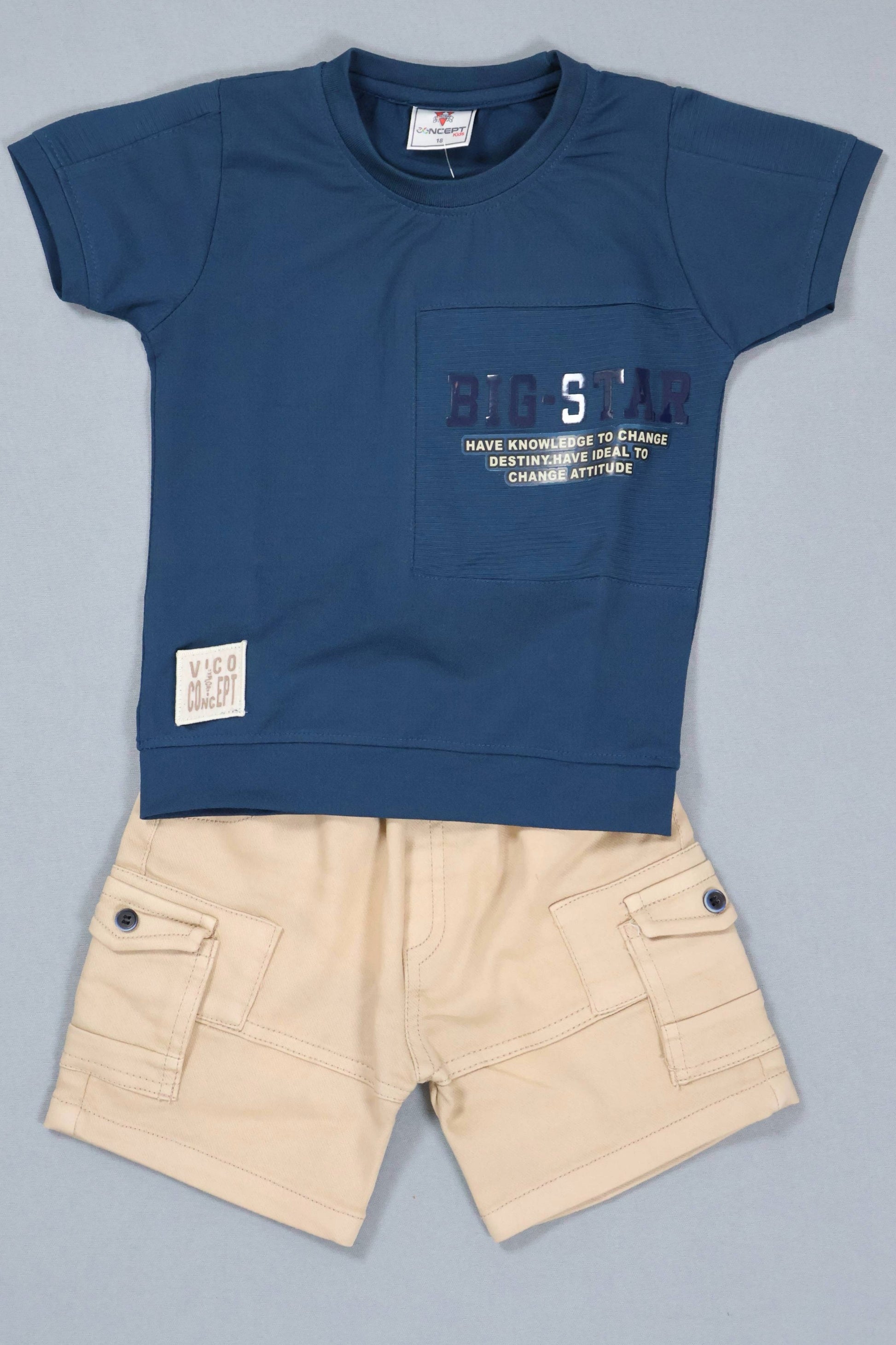 The set includes a blue "BIG STAR" printed t-shirt and beige cargo shorts, both neatly folded and carefully packaged to ensure their vibrant colors and crisp construction are preserved in transit. The packaging protects against wrinkles and keeps the set fresh and ready to wear for both retail and direct-to-customer deliveries. Fast dispatch and secure packing provide a positive unboxing experience for shoppers.