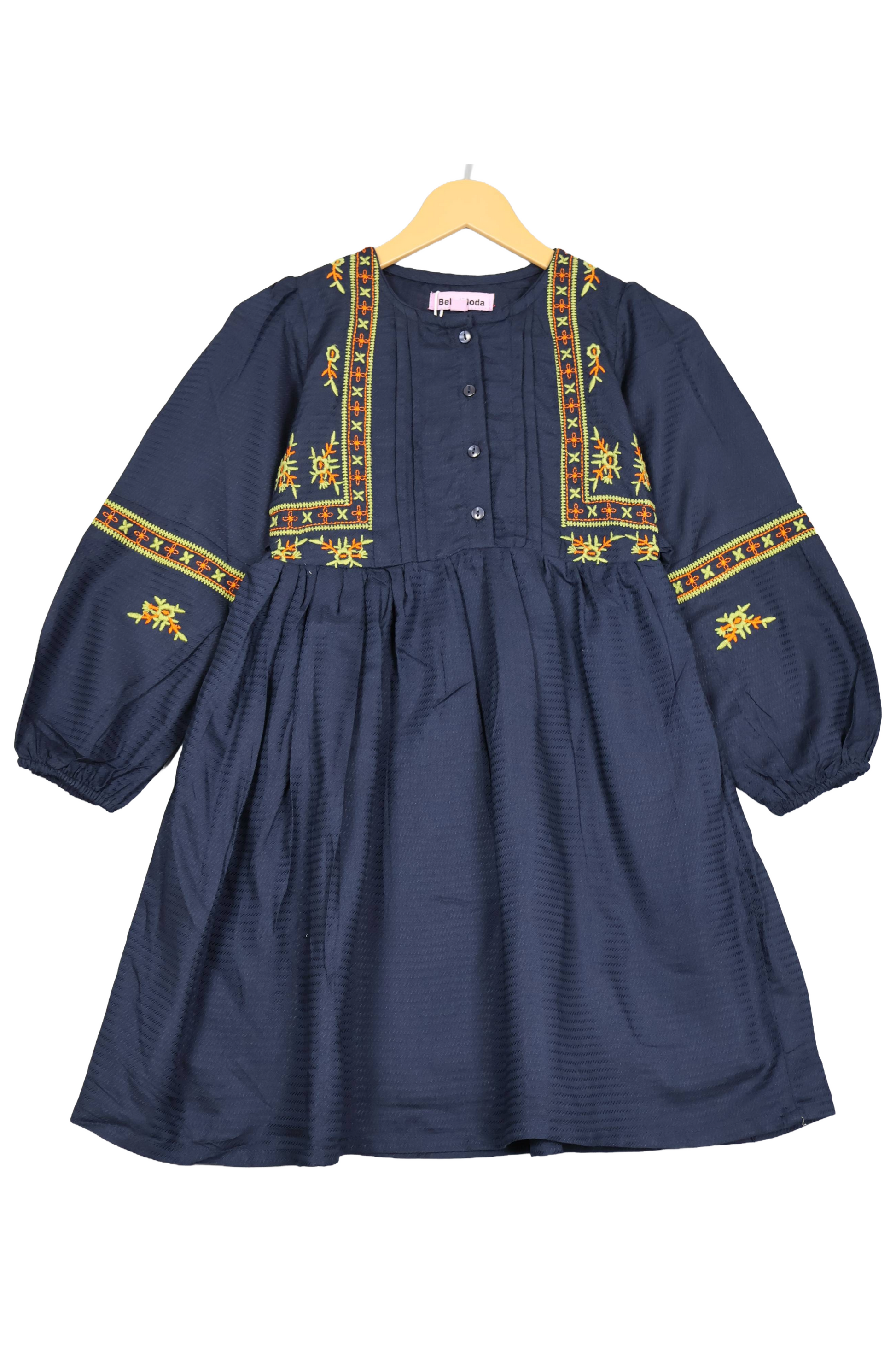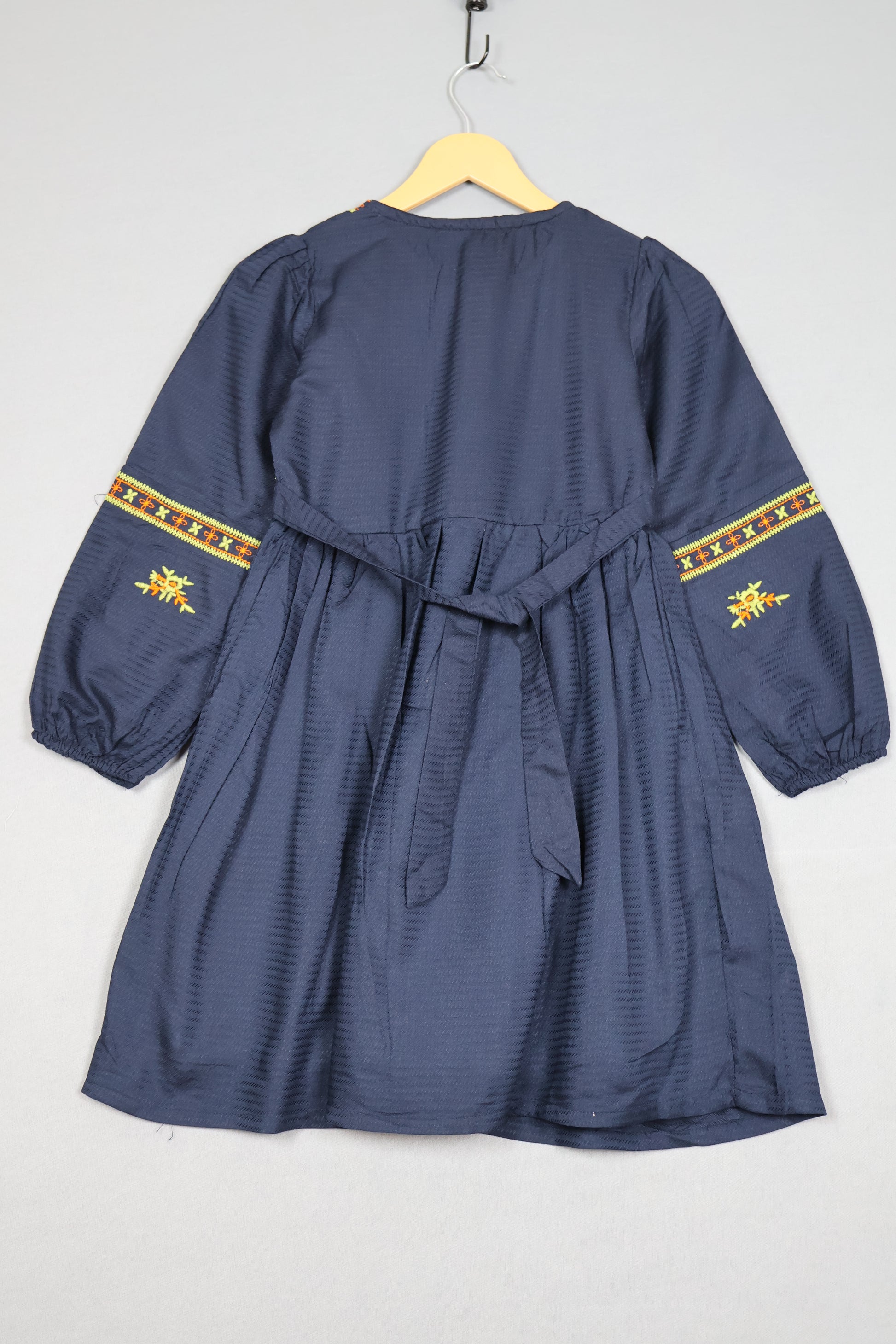 This navy blue dress with vibrant embroidered details is carefully packed to ensure the fabric and stitching remain pristine during shipping. Lightweight and simple to handle, it is dispatched quickly and arrives ready to wear, ideal for special occasions or everyday elegance. The dress reaches you safely in perfect condition, ready to add style to any child's wardrobe