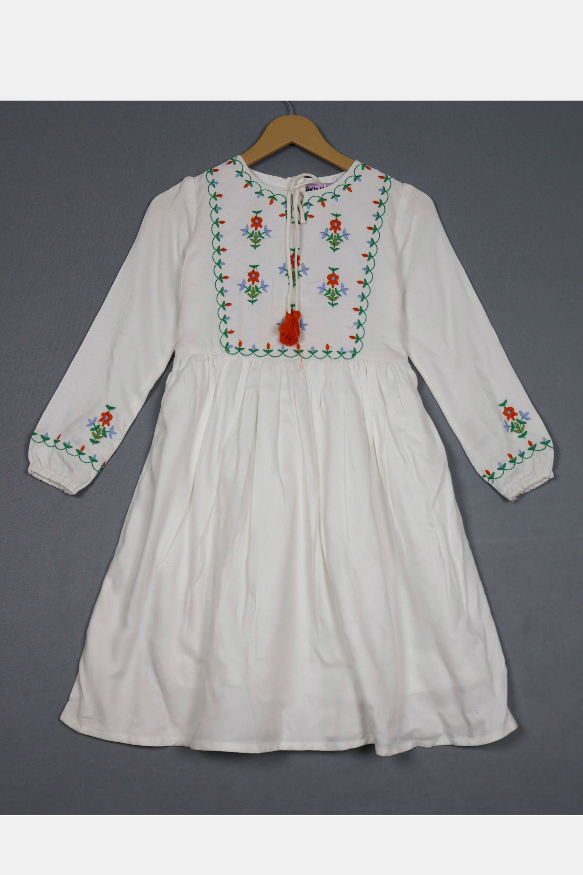 This classic white frock with floral embroidery is securely packed to preserve its pristine color and delicate embroidered details during shipping. The lightweight material allows for convenient handling and fast, safe delivery to your location. Arriving ready for immediate wear, this frock is ideal for festive occasions, celebrations, or as a thoughtful gift.