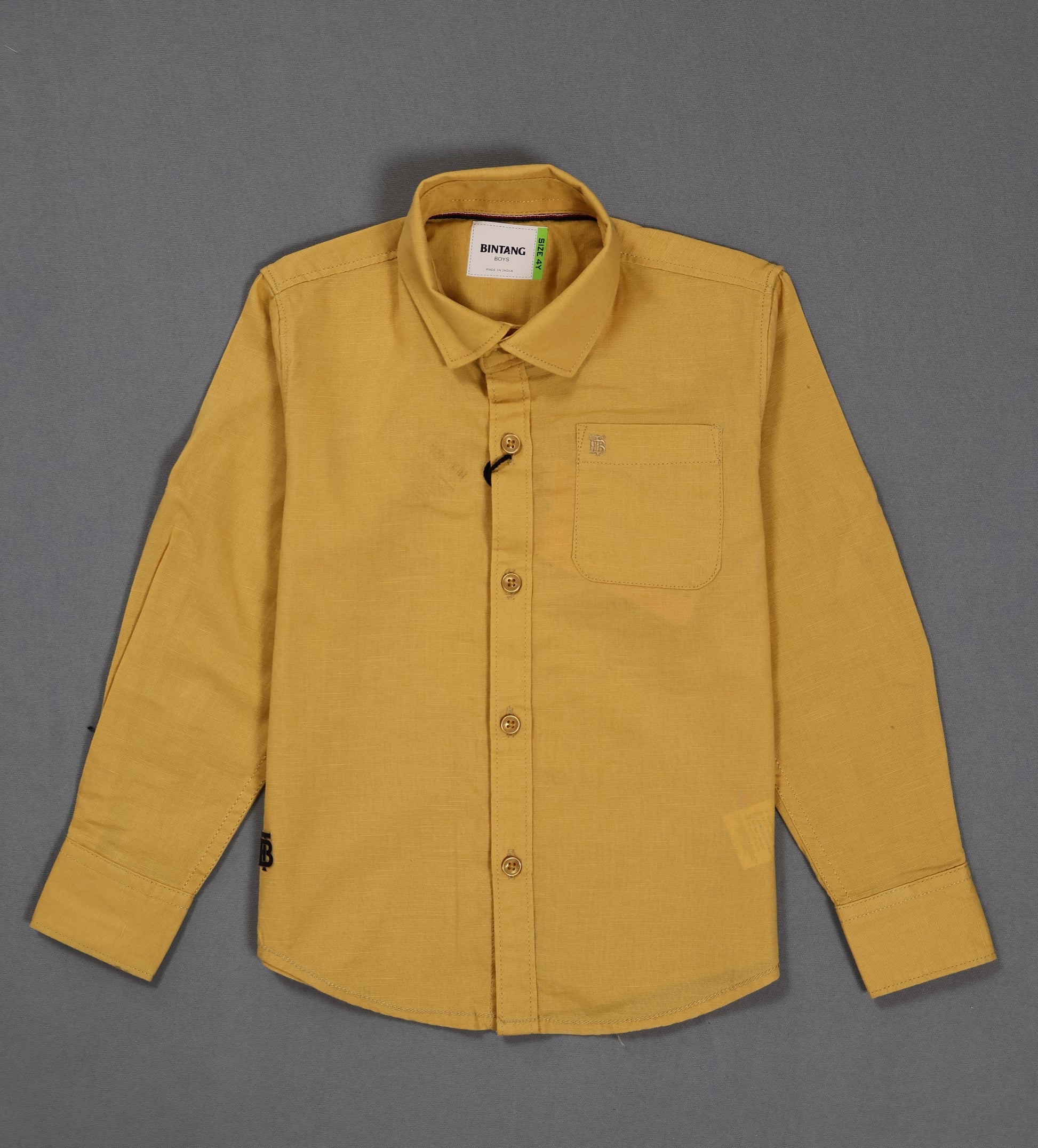 Crafted from a soft, breathable cotton blend, this shirt features a striking mustard yellow hue, a chest pocket, and a classic button-up front. The simple full-sleeve design and smart collar provide timeless style and versatile day-to-day wear. Easy to maintain and comfortable for all-day use, it keeps kids looking sharp and stylish.