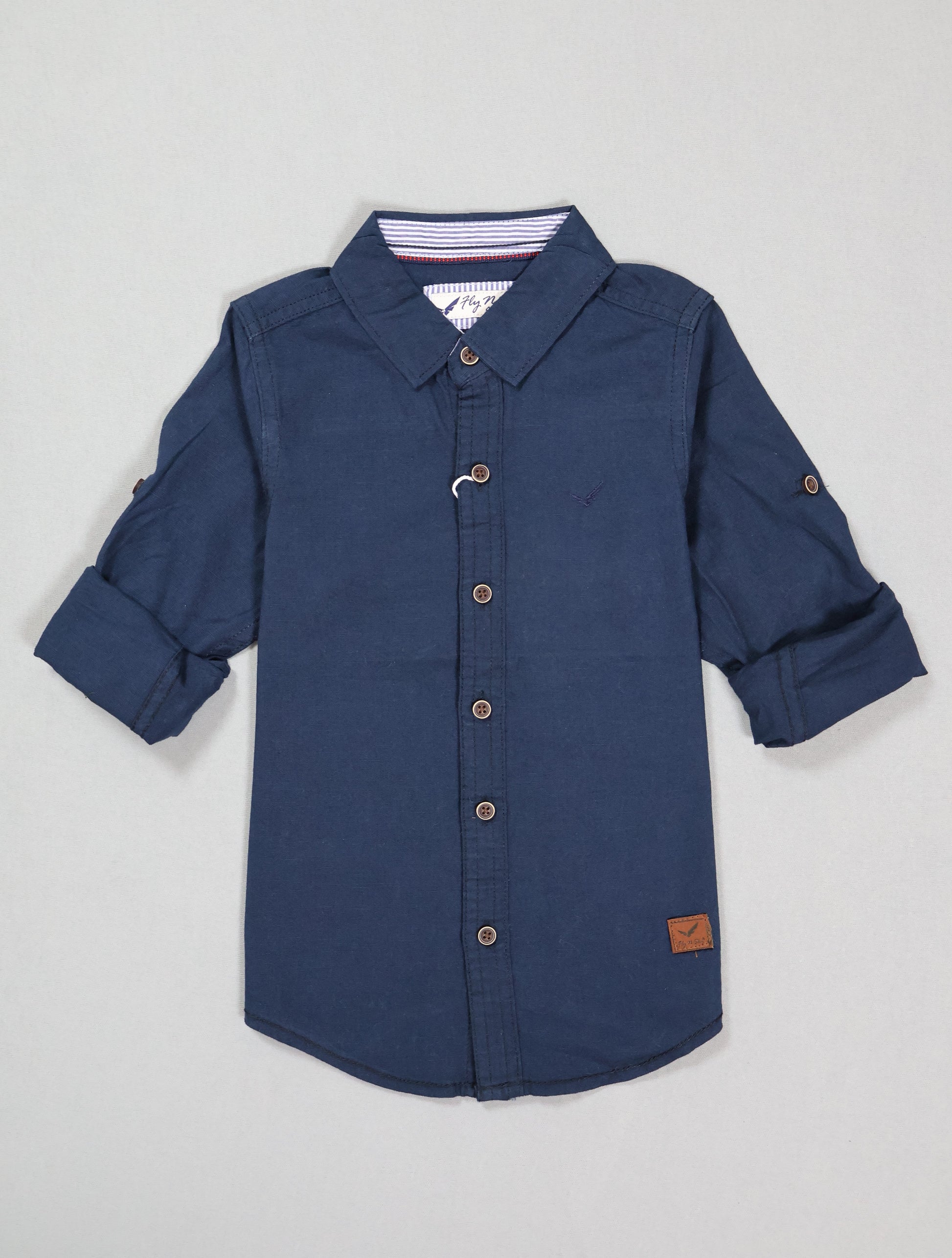 Crafted from a soft, breathable cotton blend, this shirt showcases a rich navy blue tone with brown buttons and a subtle patch detail above the hem. The rollable sleeves and classic buttons make it versatile for a variety of looks and occasions. Designed for comfort and easy care, it keeps kids stylish and at ease throughout the day.